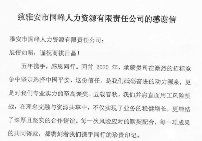 國(guó)峰公司喜獲平安財(cái)產(chǎn)雅安中支感謝信